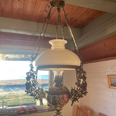 Gammel petroleum lampe. Bygget om til alm lampe med lang ledning og stik til stik kontakt.