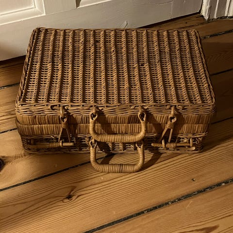 Retro kurvekuffert, som mine bedsteforældre brugte, når de flyttede på landet om sommeren. Brug den til legetøj, tøj eller andet. Også fin som bord. Den måler 53 cm i bredden, 40 cm dyb og 40 cm høj. Hel, men med brugsspor, bl.a. misfarvning på låg.