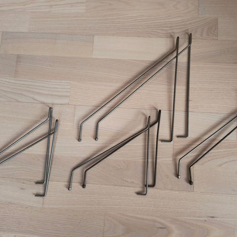 Gamle messing hyldebære med møtrik. Der er to sæt med forskellig bredde, et sæt med ca 15,5 cm og et sæt med ca 16 cm.