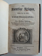 Christian Bastholm: Den naturlige Religion, saaledes som den findes i de hedenske Philosophers Skrifter. Gyldendals Forlag, 1784. Kobberstukket vignet på titelbladet. XVI+272 s. Med den udfoldelige planche bagerst 'Tabel over de berømteste hedenske Philosopher'. Indbundet i et lidt senere halvlæderbind. God stand. Sender gerne.