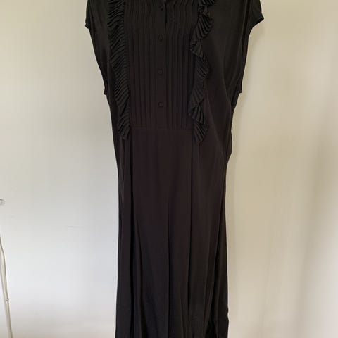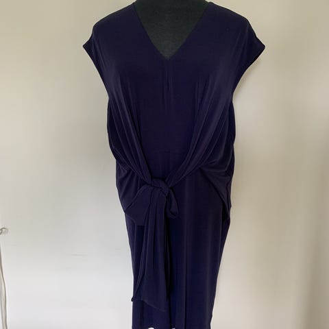 By Malene Birger kjole i mørkeblå størrelse XL. Brystmålet er cirka 108 cm og længden cirka 90 cm. Kjolen er fremstillet af 82% viskose, 16% polyamid og 2% elastan. Kjolen fremtræder med detaljer i fald i kjolen, ved venstre skulder se billede 3, ved højre hofte se billede 4 og ved venstre knæ se billede 5. Kjolen har et kort ærme se billede 6. Kjolen fremtræder så den kan anvendes ved såvel særlige som mere almindelige lejligheder.
