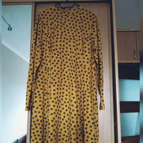 Æggeblomme-gul kjole med smukke detaljer i 100 viskose - af mærket Ghost. Hulmønster og knapper - her mangler dog flere knapper, nogle er syet til, hvilket man også fint kan gøre med resten, men jeg synes det giver et fint spil sammen med hulmønsteret.