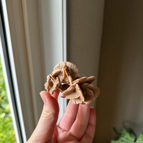 Sten med flotte krystaller i røde til mørkrøde nuancer. Måler 8 x 9 cm. Den afbillede sten er den du køber.