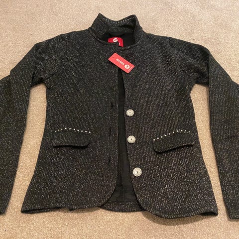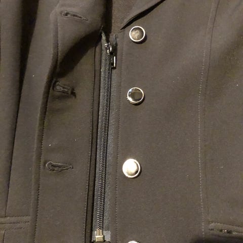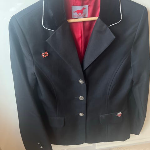 Mørkeblå stævneridejakke i usædvanlig fin stand. Du kan næsten ikke se, den har været brugt. Str 36/38. Kraven er kantet med sølvtråd. Mærke: Sportsmaster