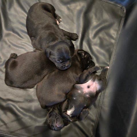 -Far: Lilac Tri Merle, 60% engelsk staffie, 30% engelsk bulldog og 10% olde engelsk, 2 år teenager og 22 kg – stærk, sund og fuld af leg. Han elsker alle hunde og kan næsten ikke styre sin glæde, så han piver tit, når han møder dem. Han gør sit bedste for at være “manden i huset”, men sandheden er, at han bare er en kærlig, stor baby.
