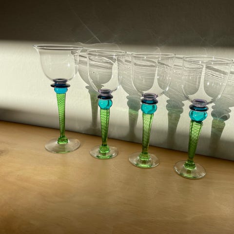 To smukke, sjældne vinglas med ansigter fra Ittala, Fiona Ramanssi, design Mikko Karppanen sælges for kr 100 pr stk plus porto. Glassene er stort set ubrugte, De måler ca 22 cm i højden.