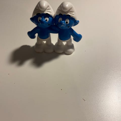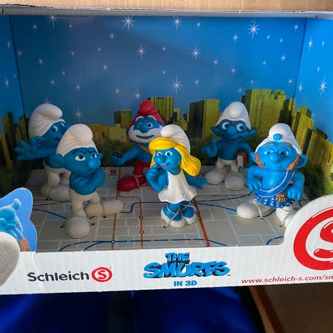 Schleich Smølfer Figurer Sæt af 7 i forskellige positioner og tilbehør. Farverig samling af blå smølf figurer, herunder karakterer med værktøj og dyr. Ideel til samlere eller som legetøj til børn.