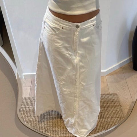 Nederdelen er lavet af denim og lycra materiale og har en længde, der går ned til anklerne.