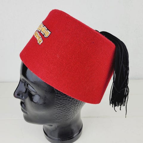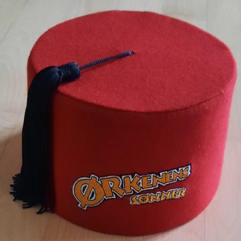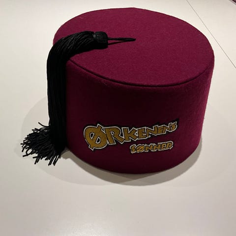 Original fez fra Ørkenens Sønner, rød med broderet logo foran.