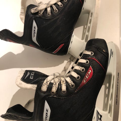 CCM Ishockeyskøjter i størrelse 34. Skøjterne er designet til ishockey og har en sort farve med grå detaljer. De er velegnede til børn og er fremstillet med materialer, der understøtter sporten.