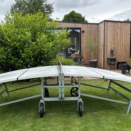 Står samlet og er let at flytte da det kan slås op og er på hjul.