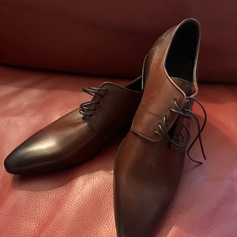 Flad elegant BOSS sko der er helt ny. Det er ikke, fordi skoen har været brugt, at der er slidmærker på lædersålen, det er, fordi jeg har slebet dem med sandpapir for at undgå, de ville være glatte at gå med. Skoen er som nævnt med lædersål og i øvrigt med læder overdel.