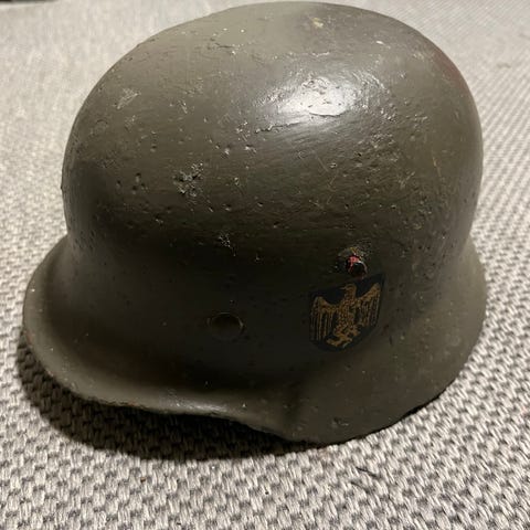 Super fin tysk M35 Luftwaffe hjelm. Den fremstår uden decal, da disse er blevet fjernet på et tidspunkt i hjelmens levetid. Hjelmen har flere lag maling, hvoraf mindst ét (sølvfarvet) er påført efter krigen. Indmaden i hjelmen er original og hører til hjelmen. Der står to forskellige navne i den.