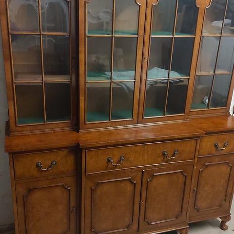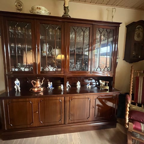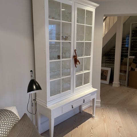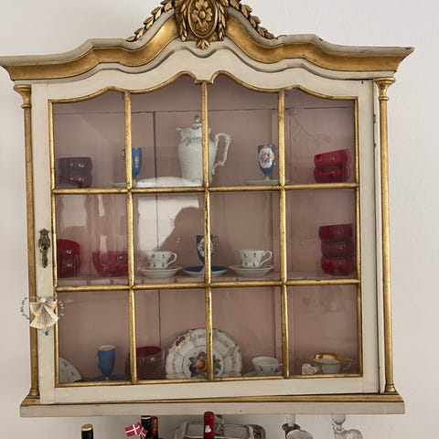 Lys grågrøn vitrine med to døre og fem hylder. Ca. år 1850.