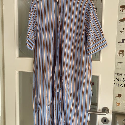 Let sommerkjole i sart blå med karry striber. Bindebånd i taljen.