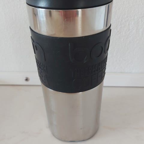 Sammenklappelig rejsekrus i rustfrit stål med krog. Krusets højde, når det er åbnet, er 7 cm. 20 kr.