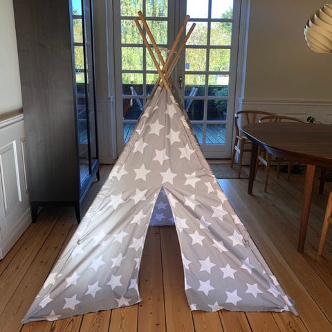 Når tipi er slået ud er højde på pinde 160 cm og højde på telt 130 cm.
