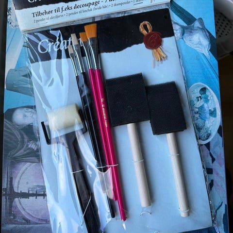 Forskellige ting til decoupage. De 2 glas med lak er gamle , så ingen garanti, men de følger med