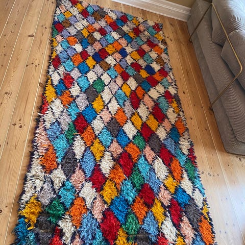 Meget flot håndlavet marokkansk boucherouite tæppe i smukke farver. Nyvasket.