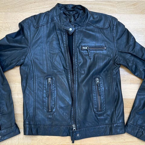 MDK læderjakke i lækker blød brun/grå læder brugt men rigtig god stand, dejlig blød ‘lining’ på indersiden.