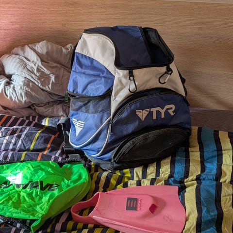 Udstyr til havsvømning. Våddragt, briller, hætte og flydetaske