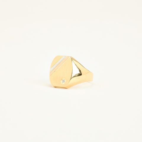 Ringen er fremstillet i 14 kt. rødguld med en blank overflade. Ringen er prydet med brillantslebne ædelsten i alle regnbues farver.
