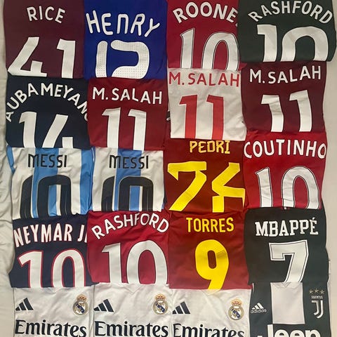Det er en blanding af både originale og uoriginale fodboldtrøjer.