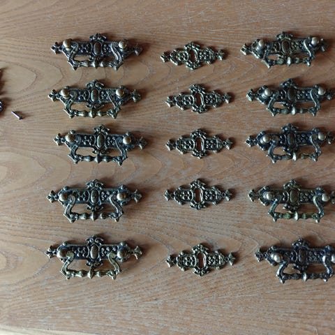 8 stk kommode greb/håndtag og 4 stk nøglehuls beslag i massive messing med patina. De måler 10 cm x 6 cm. Der medfølger skruer. Har været monteret på meget gammel kommode. Skriv gerne for mere info. Vil gerne sende med GLS.
