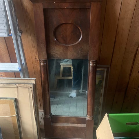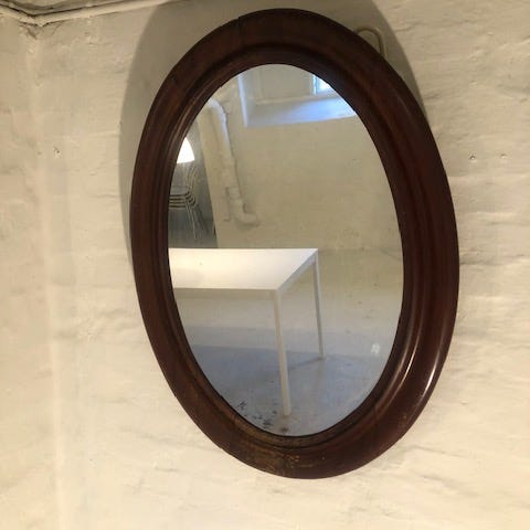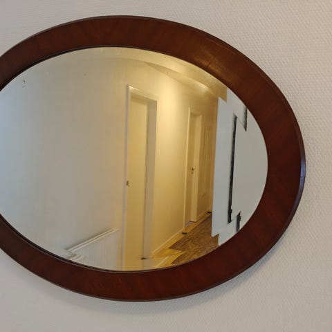 Asymmetrisk med maghoni ramme. Mål på de bredeste steder 50 x 92cm