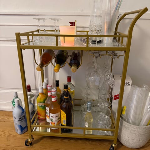 Barmøbel af ukendt art, ala fransk stil, med en marmorplade lagt på. Der kan fint stå 10-12 flasker forneden og glas ovenpå for eksempel. Har haft den i 6-7 år, men får ikke holdt så meget fest mere.