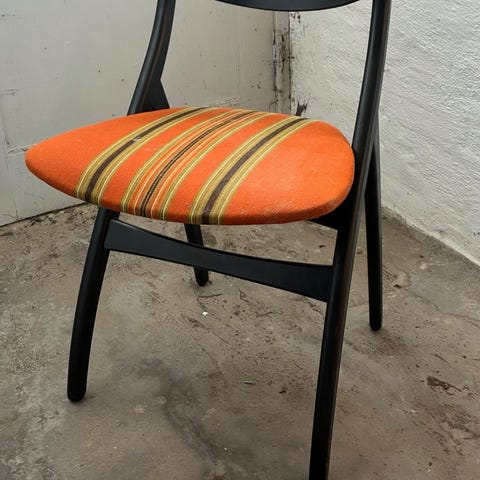 En stol er med løst sæde, som blot skal sættes fast. Alle stole har det originale stolebetræk i uld på som da de i sin tid blev købt. Uldbetræk.