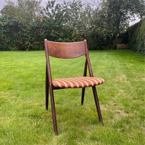 4 savbukkestole klassisk dansk design fra Sorø stolefabrik med elegant svungen ryg og originalt uldstof i orange og grønne nuancer og striber