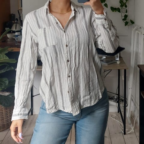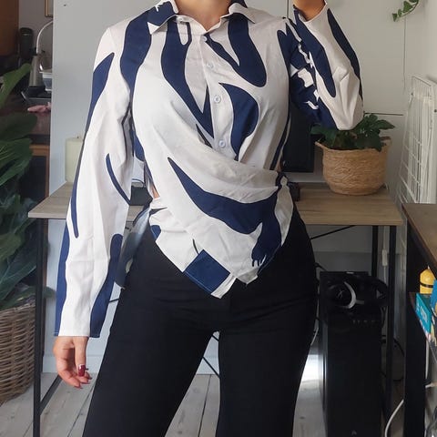 Den er rigtig fin da den kan bæres på flere måder, man kan binde den bag om, krydse over ved at lade de nederste knapper være knappet op.