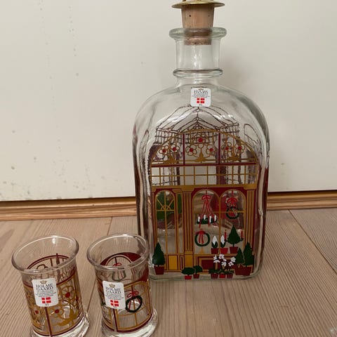 Holmegaard Juleflaske 1990, 65 cl. Mål: H: 19 cm x B: 9 cm x D: 7 cm. Samt to specielle snapseglas med indgravering. Kan sendes.
