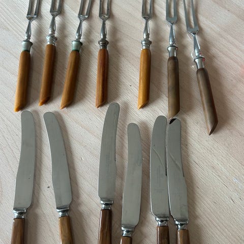 Der er 11 almindelige knive, 4 runde knive, 9 spisegafler, 4 mindre gafler og 9 spiseskeer.
