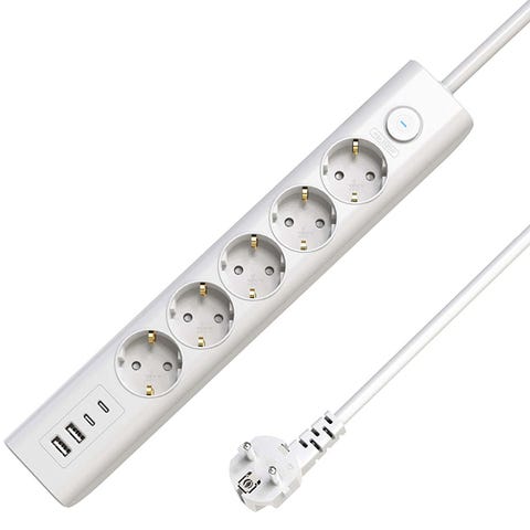 PRIS-MATCH! 3-vejs USB Schuko forlængerledning med tænd/sluk-knap, hvid | 1,5 meter (230V 3x CEE 7/3 + 2x USB-A, 2x USB-C) | Stikdåse med 3 udtag, 4 USB-porte, børnesikring og ON/OFF kontakt. CE og RoHS godkendt, perfekt til hjemmet eller kontoret.