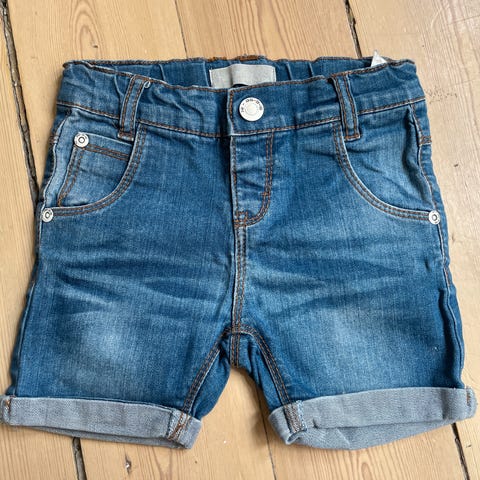 Denimshorts fra Name It i str. 80. Oprindeligt lange bukser, som er syet om til shorts. Kommer fra røgfrit hjem og er udelukkende vasket i parfumefri vaskemiddel.