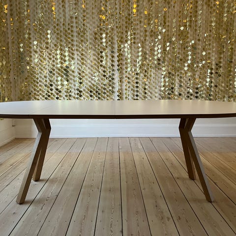 Super pænt, nogle få meget små skrammer (billeder) samt nogle små bobler (billede) i den ene ende af bordet. Hvid laminat.