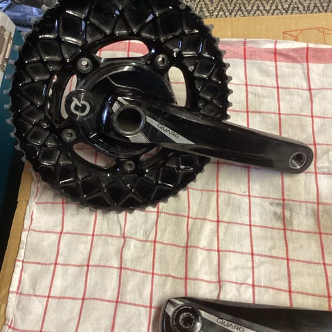 Wattmåler fra Power2max på et Specialized Kranksæt. Venstre pedalarm er desværre gået i stykker, men kan følge med i handlen.