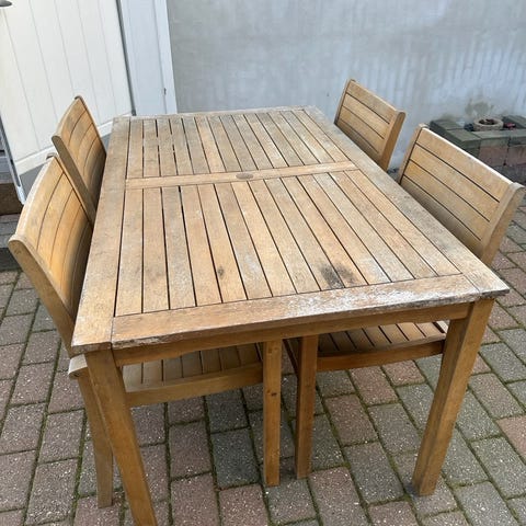 4 stole, vi elsker patina og har derfor ikke givet olie, 2 flasker olie følger med.