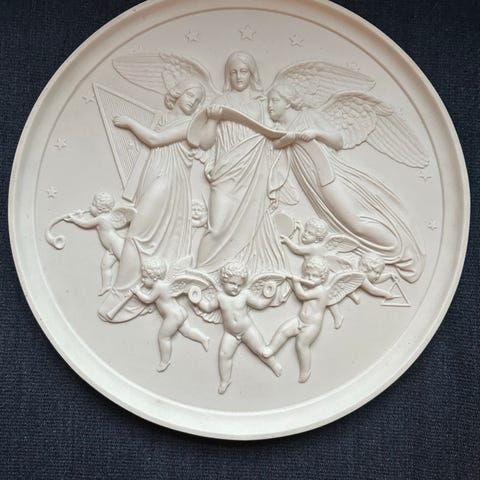 Motivet er tegnet af Bertel Thorvaldsen, Relieffet viser Juleglæde i Himlen, med engle og små puttier med julebudbringelsen. Diameter 15 cm. Fragt koster 45kr til pakkeshop. Eller afh i Ribe. Giv gerne et bud