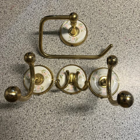 Flotte badeværelses elementer i tung messing 70erne - sæbeholder - håndklæde holder - knager - papir holder - toiletrulle holder. Der er også en håndklædestang.