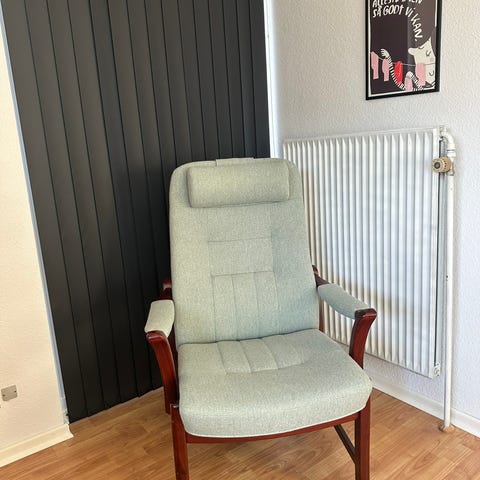 Nydelig otiums lænestol + taburet fra Farstrup.