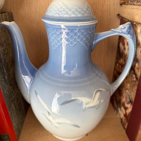 Mågestel B&G Kaffekop 10stk ; Underkop Ø13,5 13stk+2 m/skår; Kagetallerken Ø15,5 11stk+2 m/skår; sukkerskål; lille flødekande; kaffekande; 2 lysestager; lille vase/tandstikholder; Frokost, alm, og dybe tallerkener er SOLGT