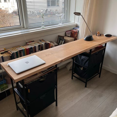To skrivebordsplader en lille og en stor .Der er seks ben med,Som kan justeres højden så de passer hvis ens gulv skulle være skævt🙃 oprindeligt sad de forskudt af hinanden. Jeg kan ikke huske hvordan det skal samles. Det er et designer bord i lyst lakeret egetræ. prisen er for alle dele . målet som står i annoncen er på det store bord. mål på lille bord ses på billeder
