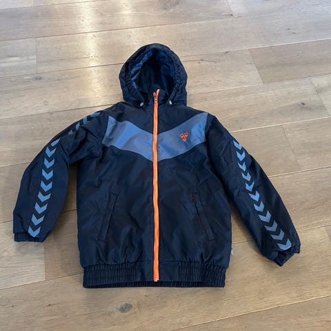 Let børnevinterjakke fra Hummel i mørk gråblå og med grågrønt foer. Knappet hætte og 2 lommer med knaplukning. Str 140.