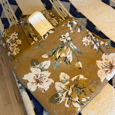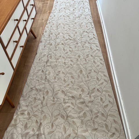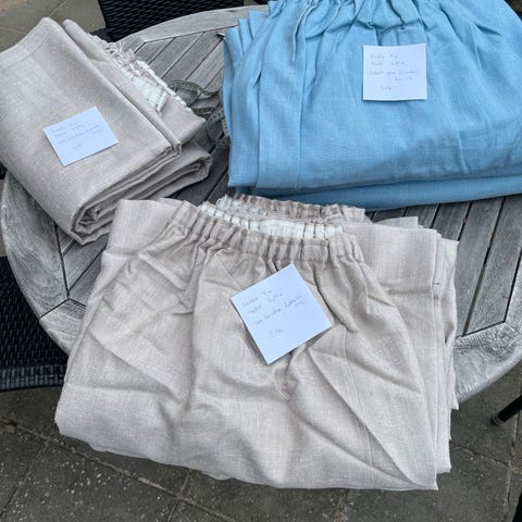 Pænt sæt hørgardiner i beige med hvidt tryk. Hjemmelavet i let gennemskinneligt hørstof fra Ellos. I fin stand, dog skal nævnes, at der på det ene gardin er et lille næsten ikke synligt skjold, se billede. Ellers intet slid. Løbegang ca 3,5 cm. Et pudebetræk, der er noget mere brugt i stoffet men stadig brugbart, medfølger. Se billeder. Nyvasket fra røg- og dyrefrit hjem. 30 kr. for det hele.