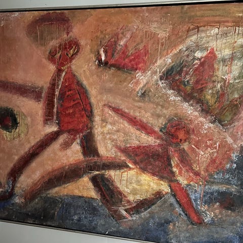 Abstrakt maleri indrammet kunstværk med farverige elementer. Maleriet indeholder geometriske former og lyse farver, hvilket giver det et moderne udtryk. Perfekt til at tilføje et kunstnerisk touch til ethvert rum.