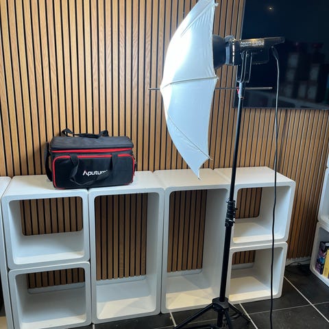 Sælger mit Aputure Light Storm LS 1/₂w LED-lys med Anton Bauer-controller boks. Slankt og solidt design med 5 500 K, CRI 98, bred lysvinkel (120°) samt trådløs dim (2,4 GHz) og DMX.