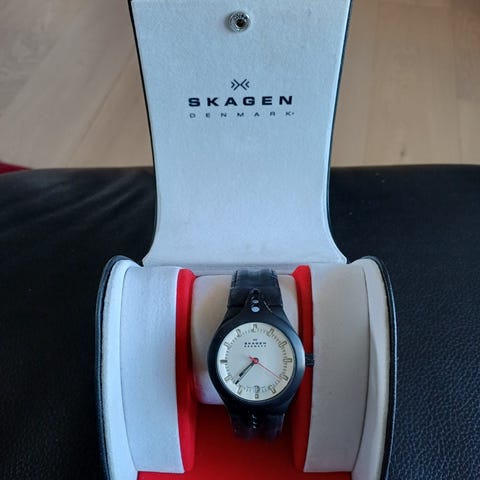 Elegant sort Skagen armbåndsur med unikt designet metalrem. Uret har en rektangulær urskive og elastisk rem med flotte detaljer. Brugt, men i god stand. Perfekt som et stilfuldt og enkelt accessorie til både hverdag og fest. Batteristatus ukendt.